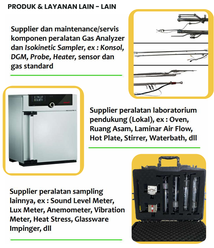 PT. Enerviro Rinata Adi menyediakan pengadaan dan layanan lainnya, seperti pengadaan Gas Analyzer berbagai merk, Gas Standar untuk keperluan CGA maupun CEMS Services, Suplier Glassware, Layanan Perbaikan, maintenance, maupun servis perlatan sampling isokinetik maupun peralatan lainnya.
